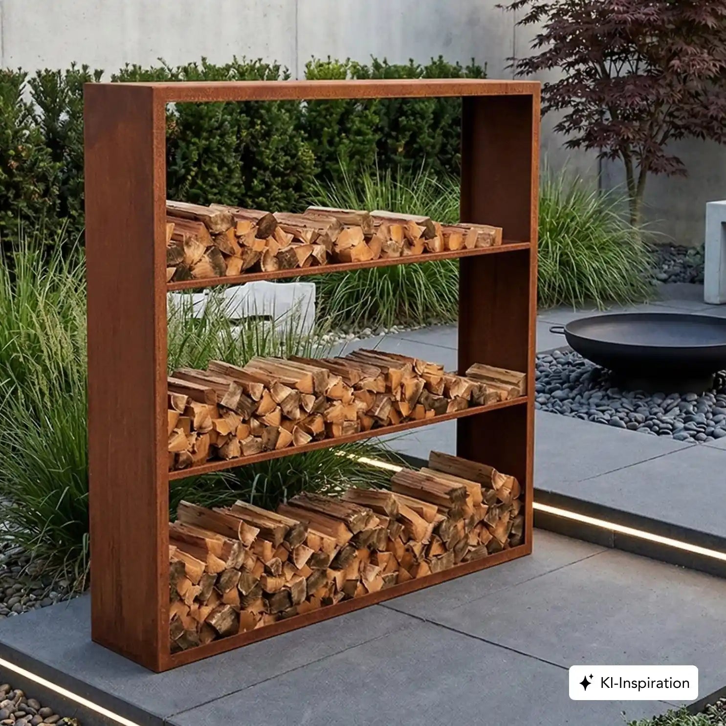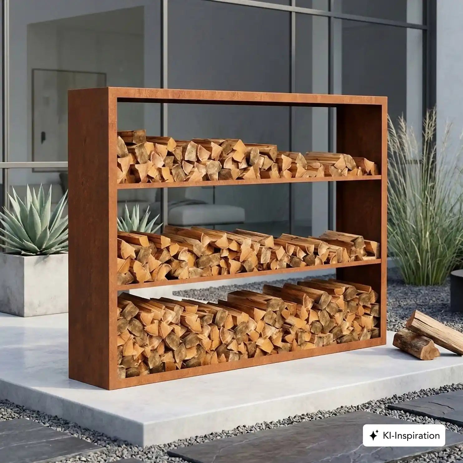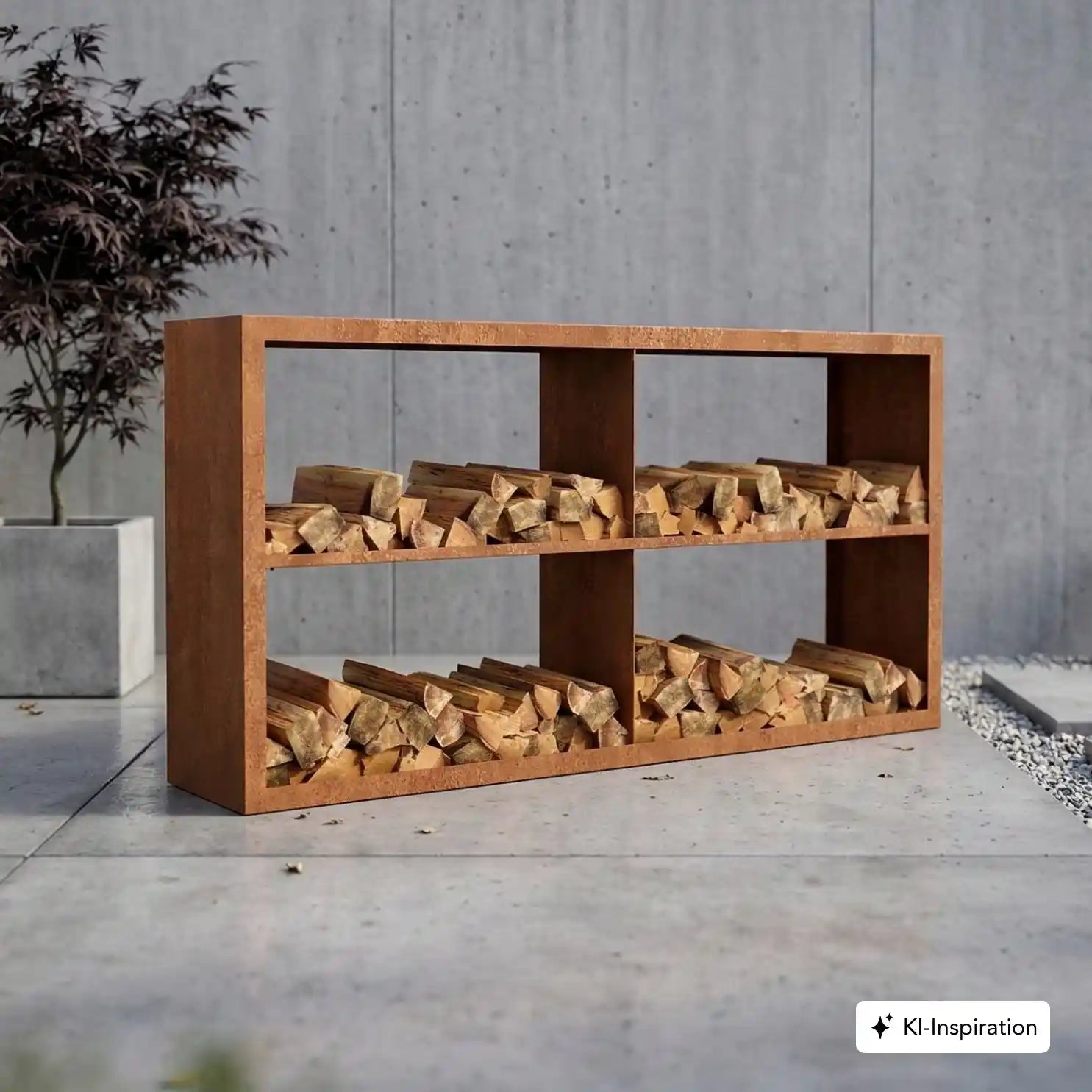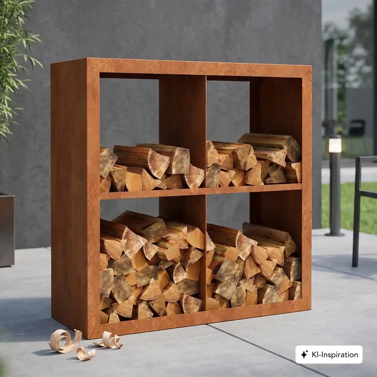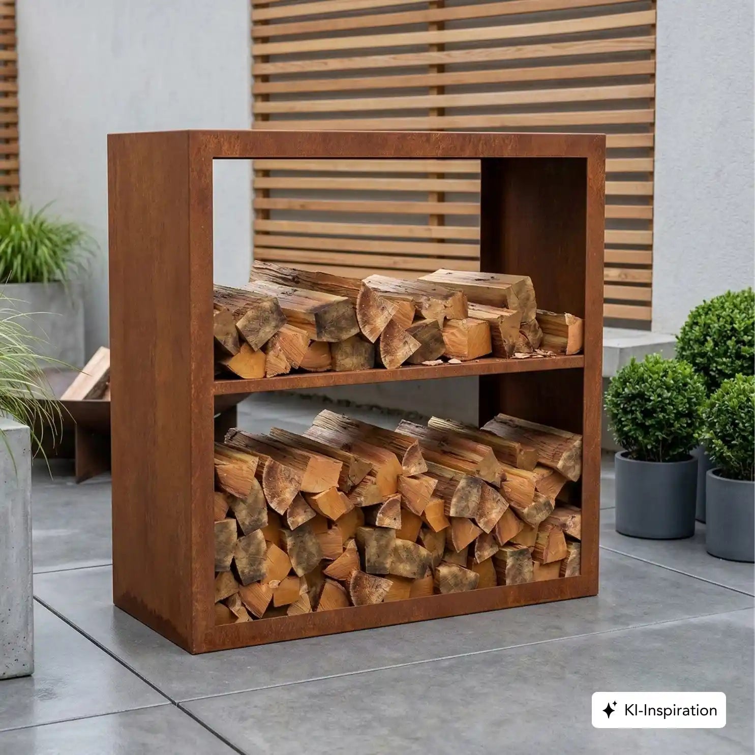 Cortenstahl Holzlager mit Holz gefüllt