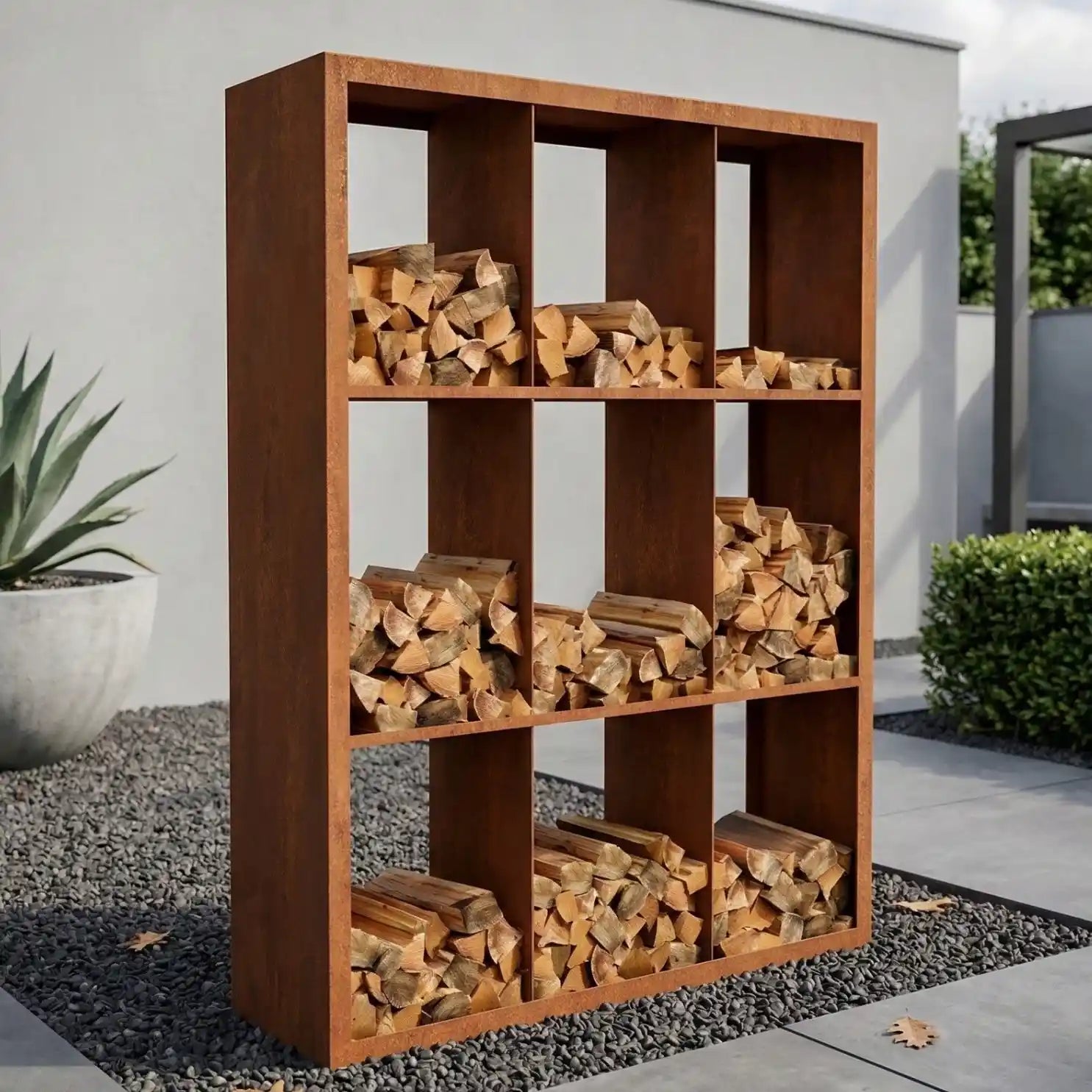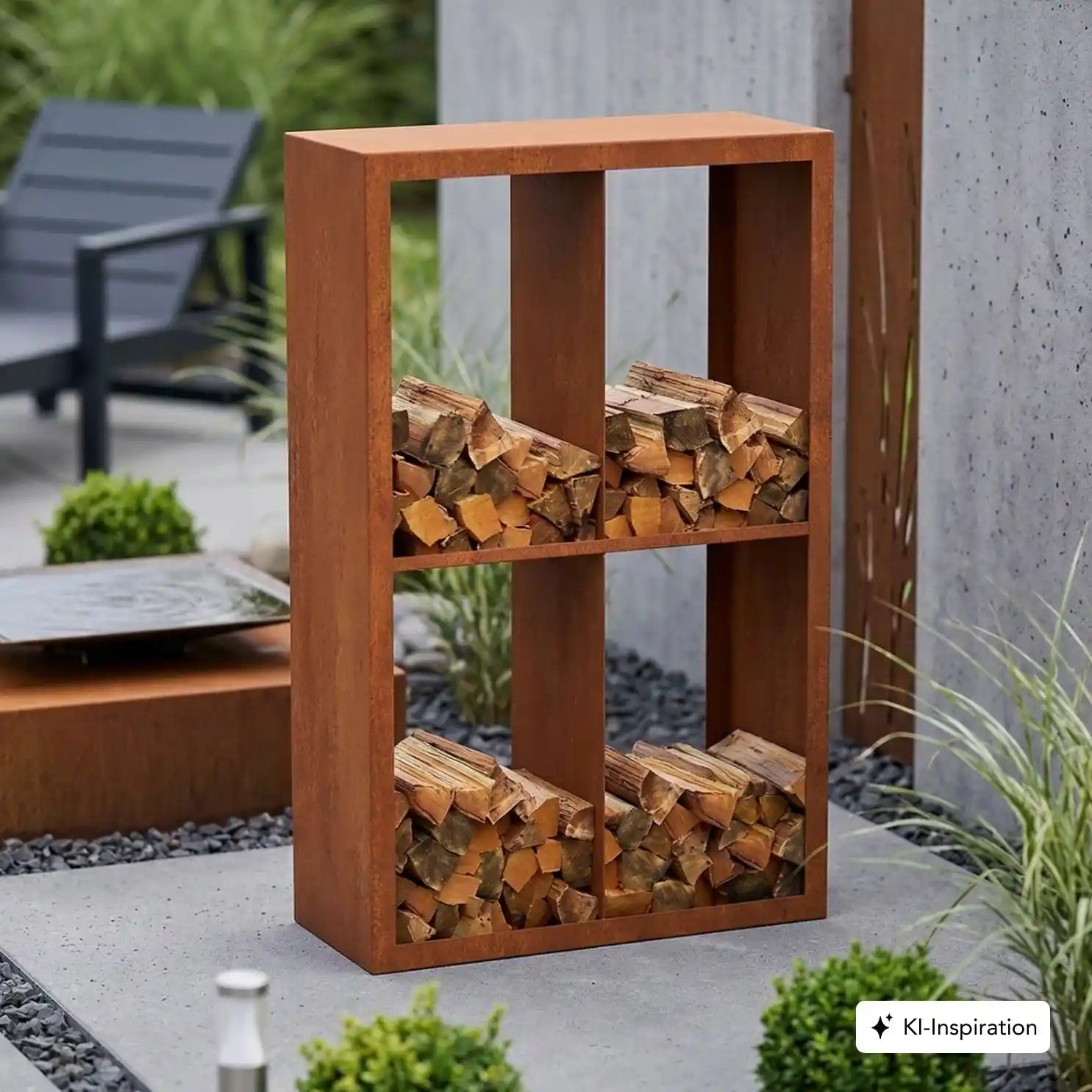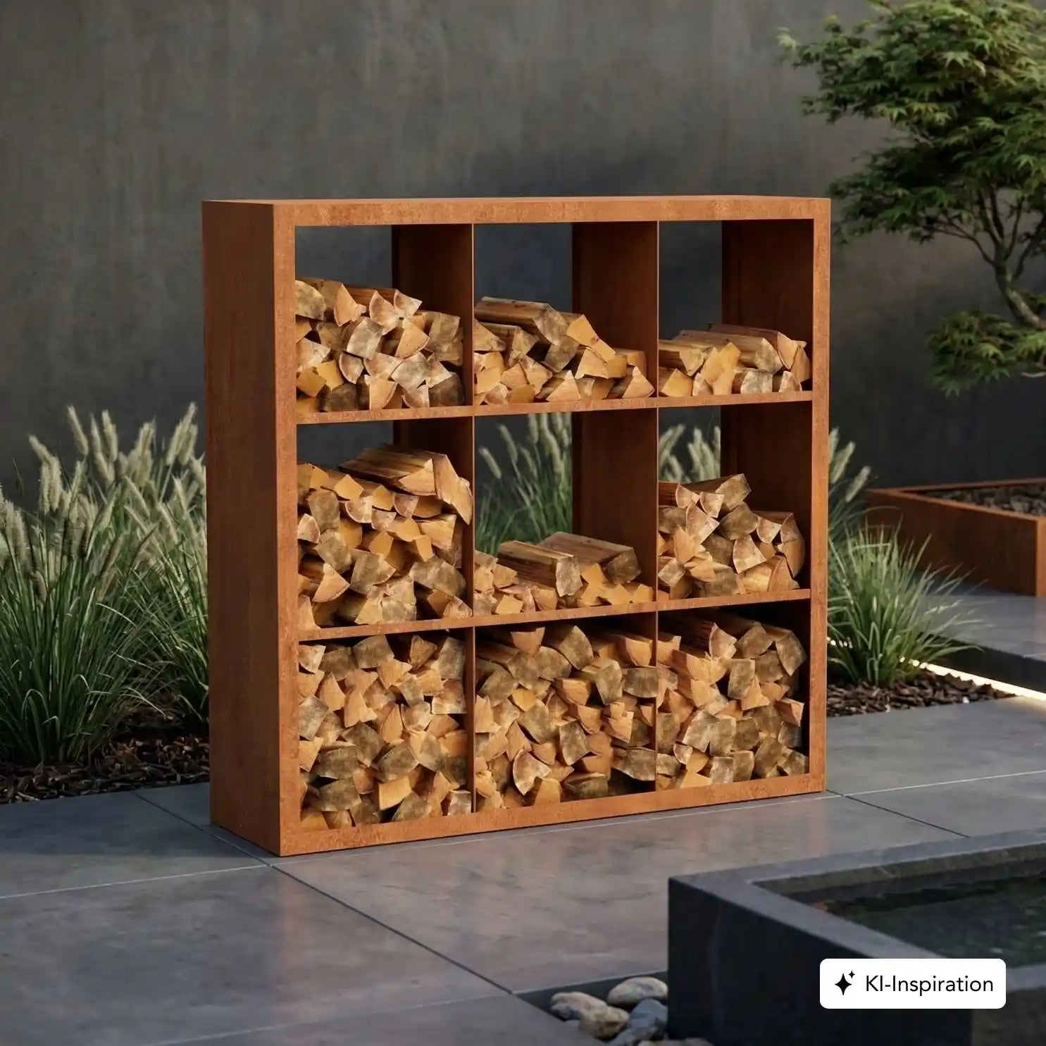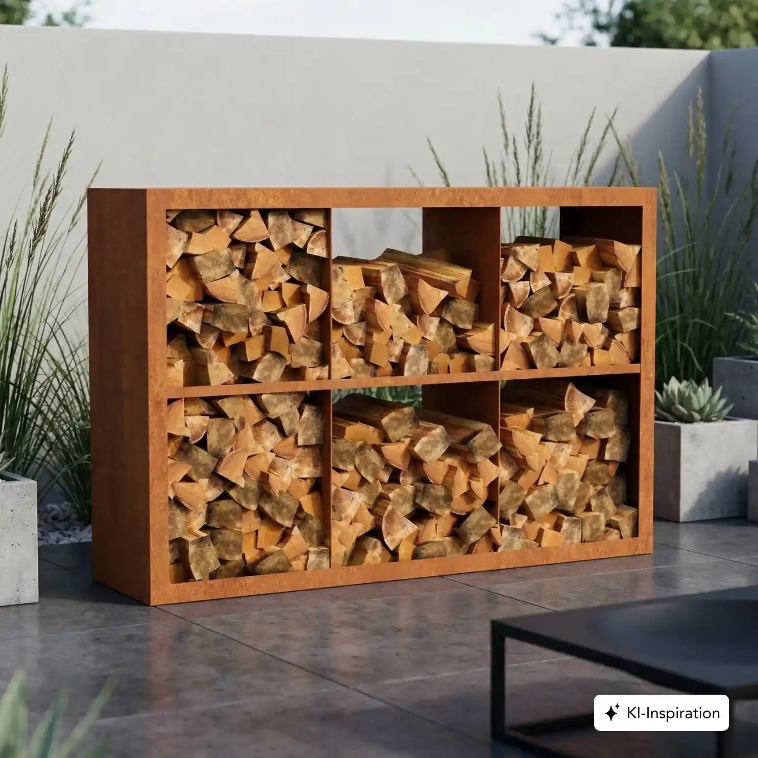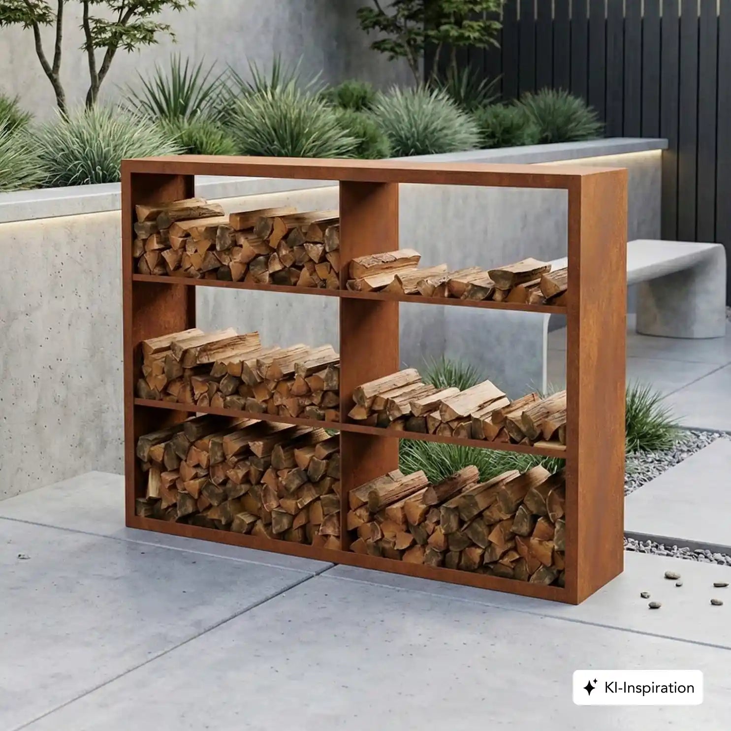Cortenstahl Holzlager mit Holz gefüllt