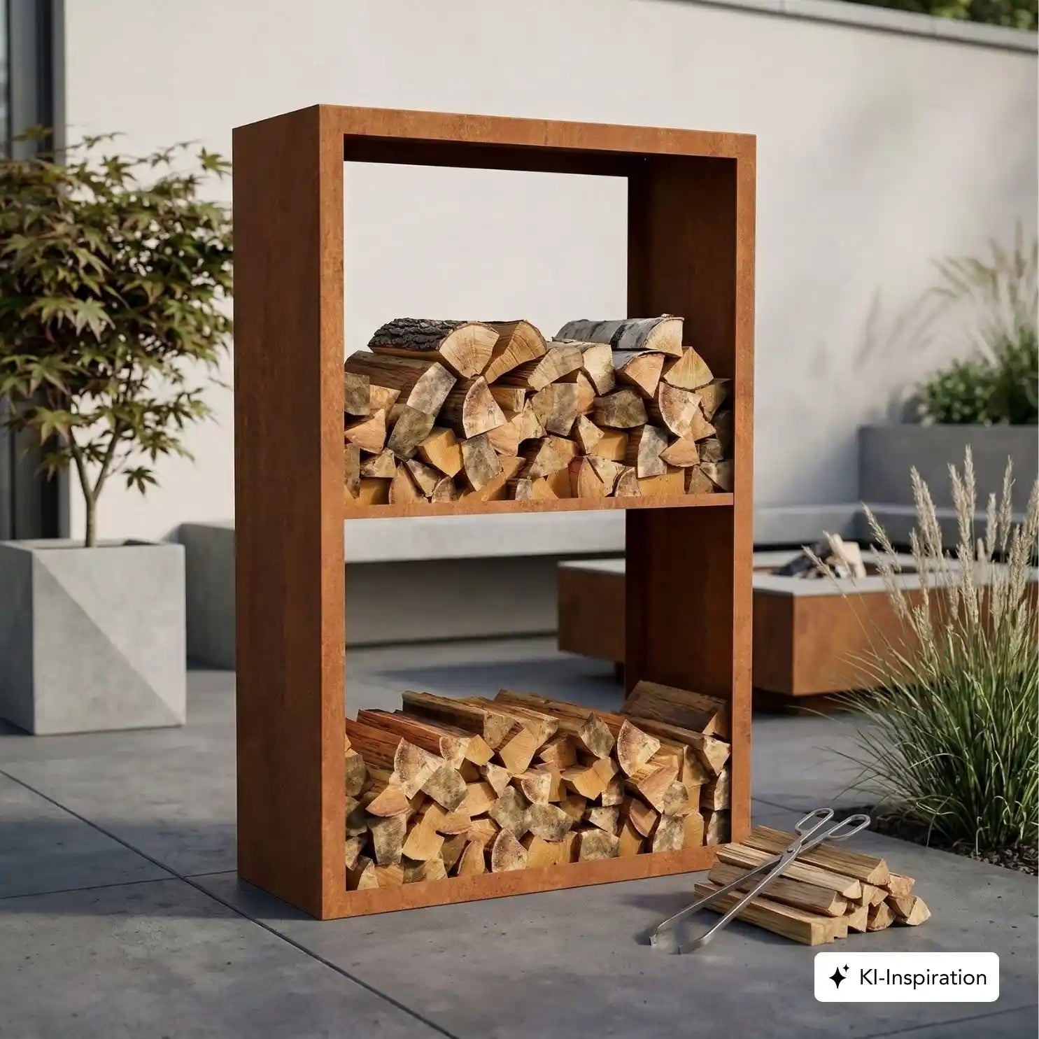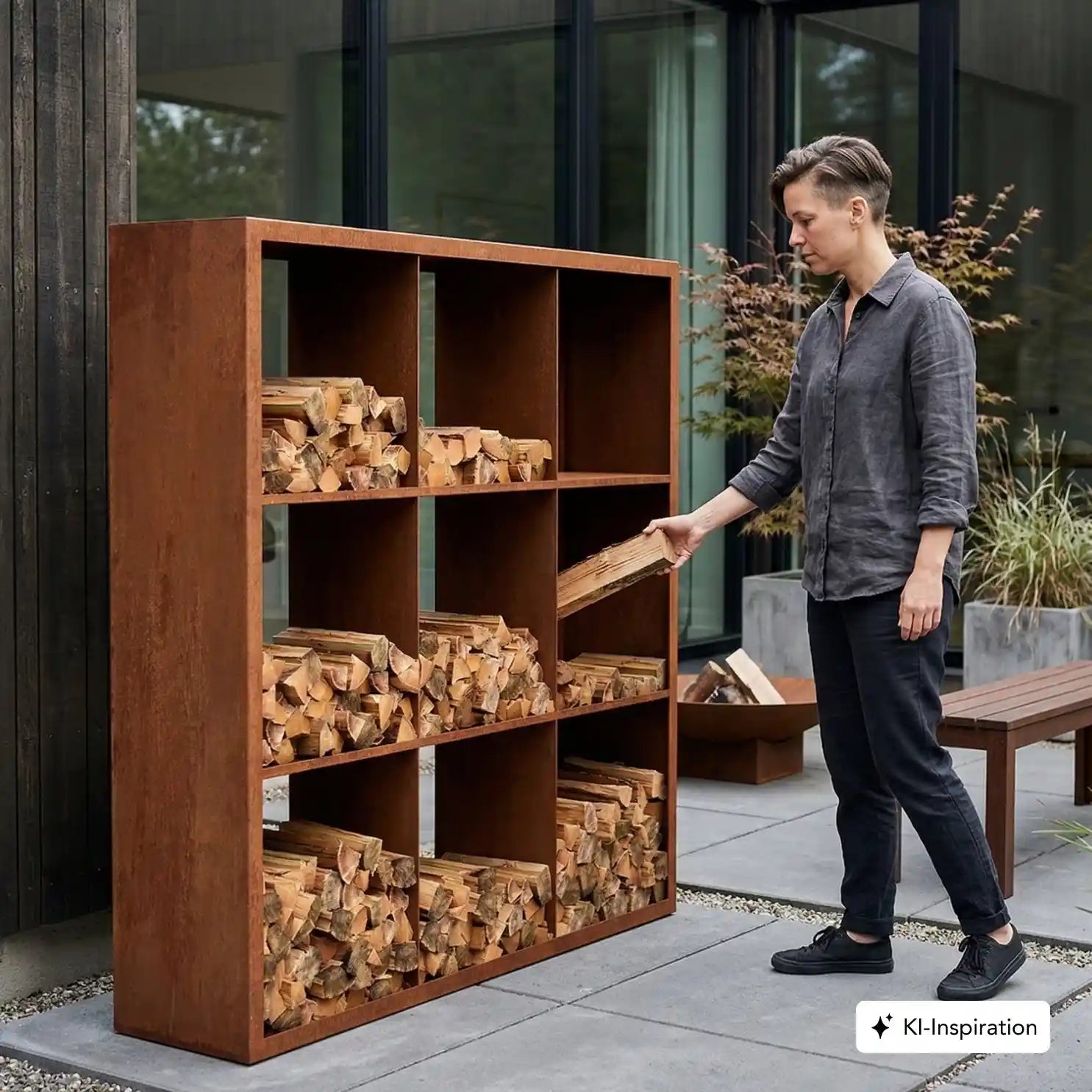 Das praktische Holzlager BANDON aus Cortenstahl ist ein schönes Außenmöbel und wertvoller Lagerplatz für dein Brennholz.