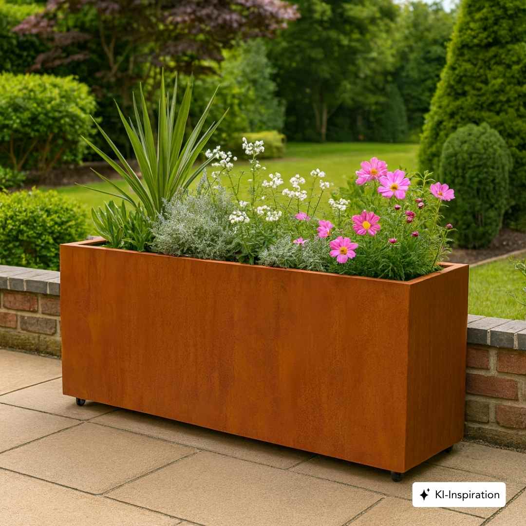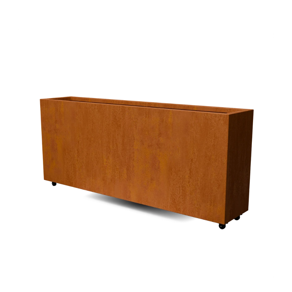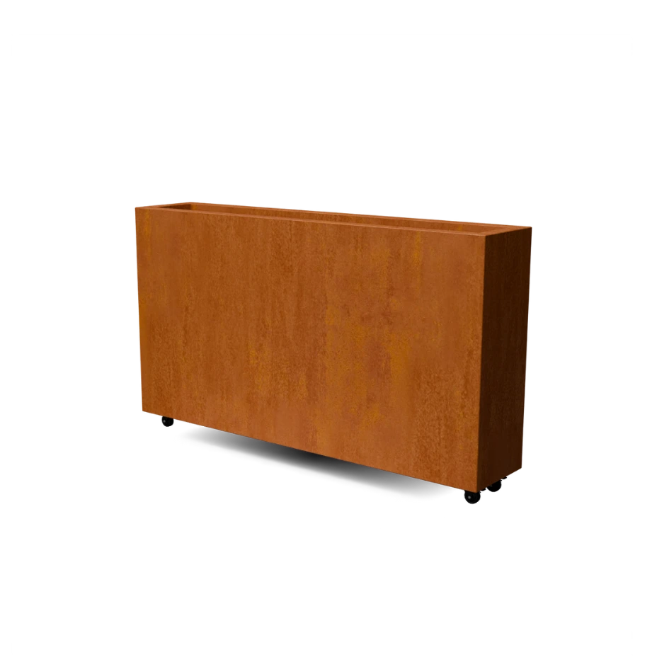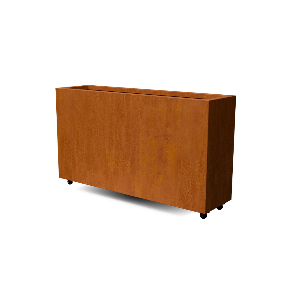 Die Oberfläche aus Cortenstahl ist äußerst widerstandsfähig und pflegeleicht. Die charakteristische Rostpatina schützt das Pflanzgefäß dauerhaft vor Witterungseinflüssen, sodass keinerlei Wartung nötig ist. Dank der stabilen Rollen kannst Du den Raumteiler jederzeit mühelos verschieben und Deine Außenbereiche flexibel gestalten.