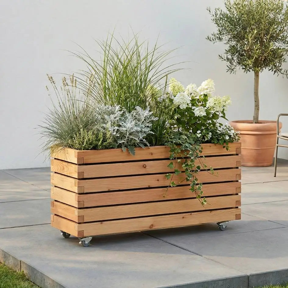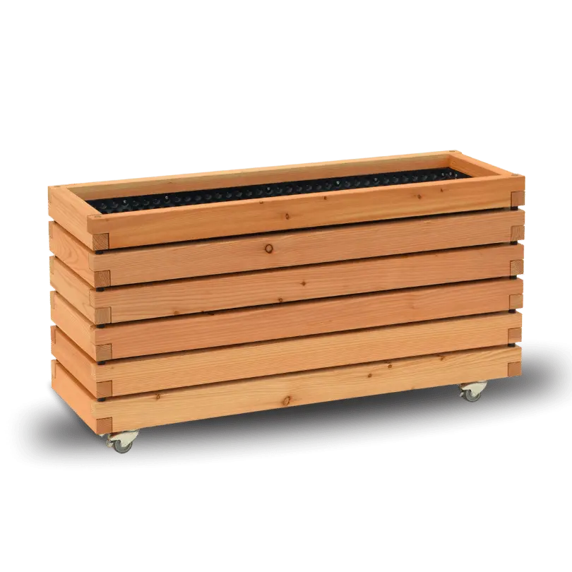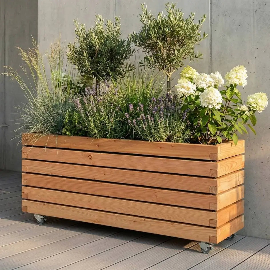 Pflanzkübel rechteckig "MORA" aus geöltem Lärchenholz mit Rollen