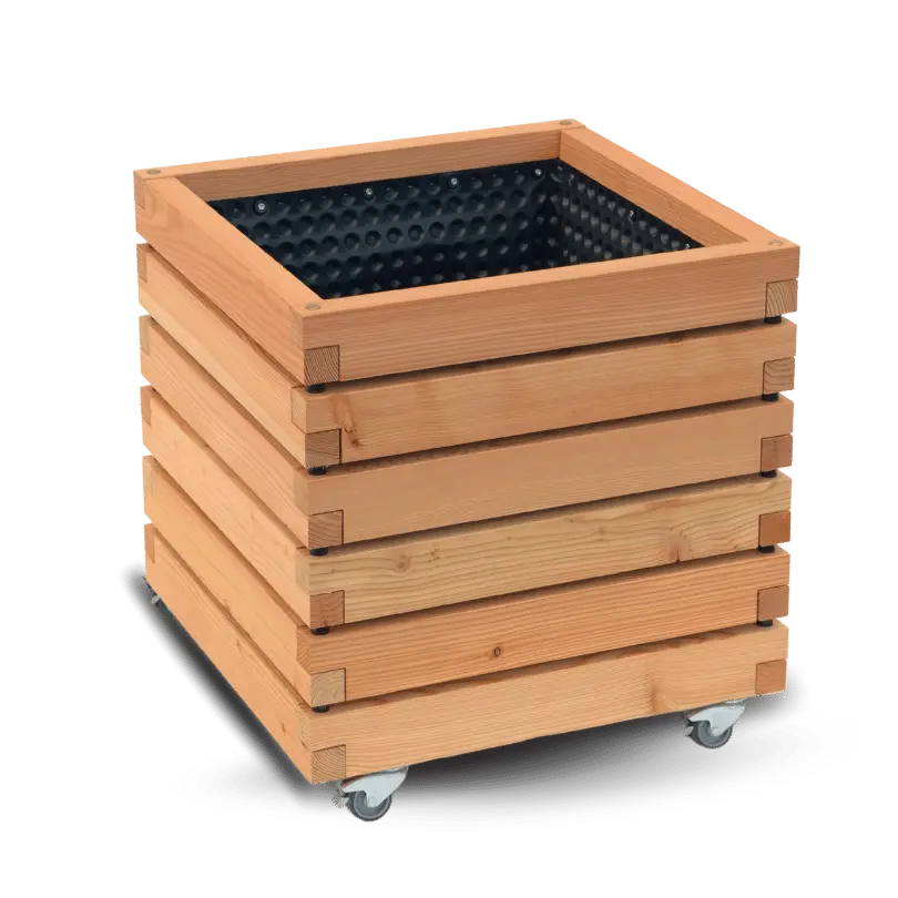 Aus diesem Grund verwenden wir nur regionales Lärchenholz und stellen sicher, dass das Holz vor Feuchtigkeit geschützt bleibt. Unsere Pflanzkübel sind daher mit einer wasserdichten Innenbeschichtung versehen und besitzen eine verdeckte Abtropfkante, die Staunässe vermeidet und überschüssiges Wasser ableitet.