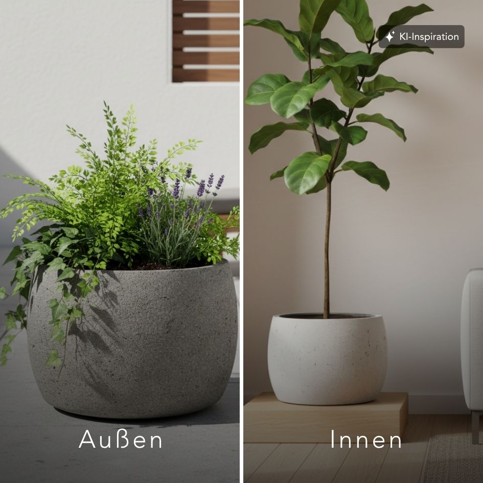 Das zurückhaltende, kompakte Design sorgt für eine ruhige, geerdete Wirkung – perfekt für ausladende Stauden, Gräser oder strukturierte Bepflanzungen in Reihe. Die leicht strukturierte Oberfläche vermittelt den Eindruck massiven Betons, bleibt dabei aber angenehm leicht und flexibel einsetzbar.
