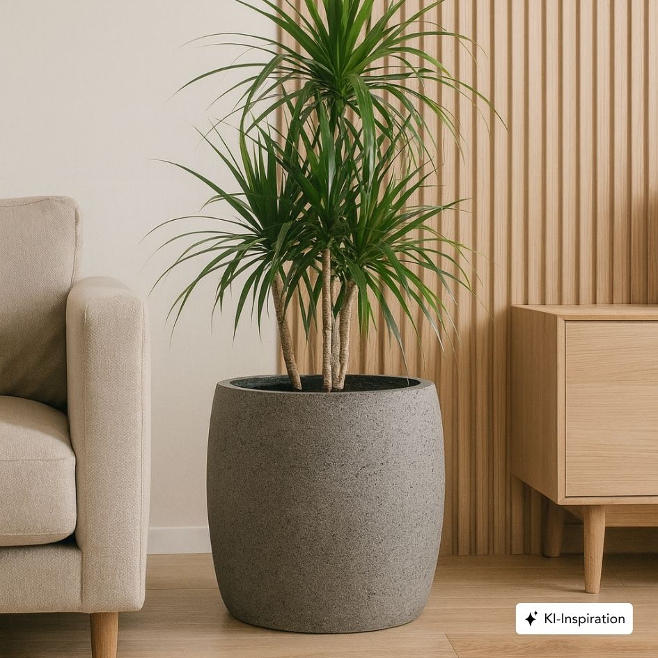 Die harmonisch gerundete Form verleiht ihm eine klassische, ausgewogene Ausstrahlung – ideal für mittelgroße Gehölze, Gräser oder saisonale Blühpflanzen. Die Oberfläche in realistischer Betonoptik sorgt für eine kraftvolle Präsenz, ohne dabei aufdringlich zu wirken.