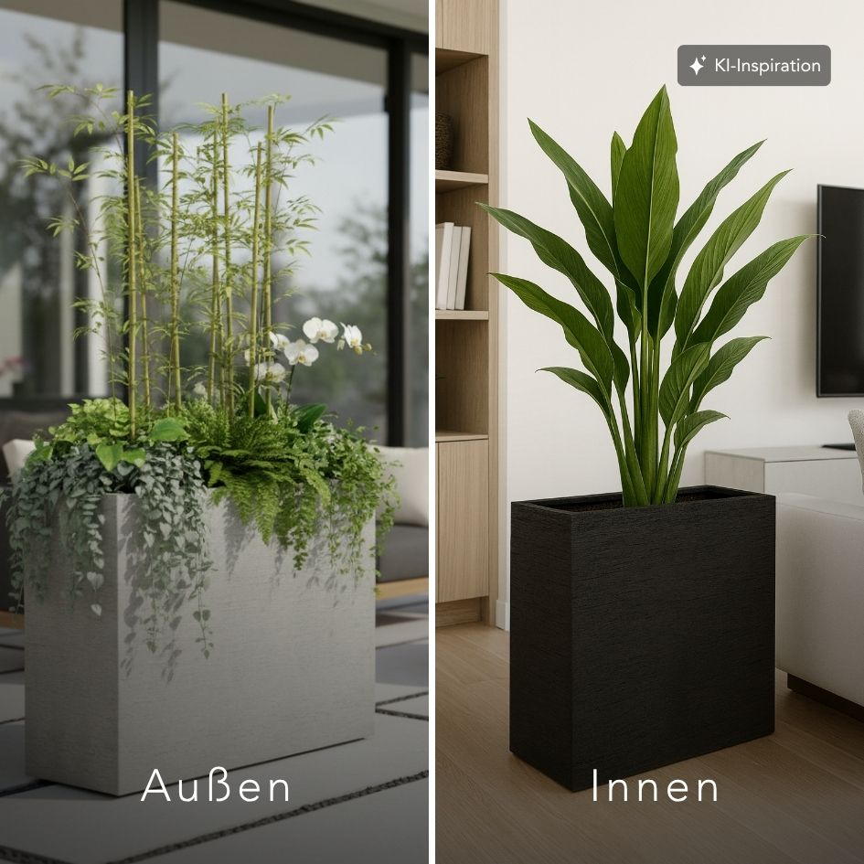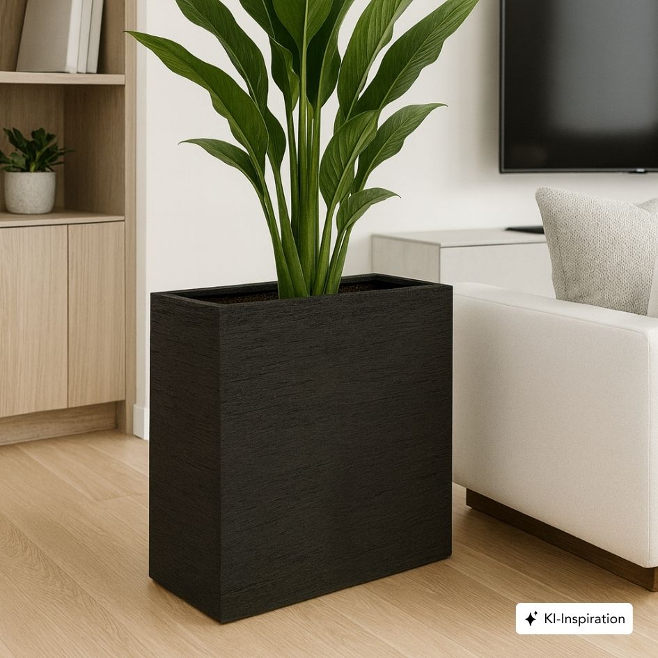 Einige rechteckige Pflanzkübel enthalten eine innenliegende Dämmung aus weißem Hartschaum (falls auf Fotos gezeigt). Diese Dämmung ist im Innenbereich sichtbar. Sie schützt vor Wärme und Kälte, dient zusätzlich der Stabilität des Behälters und sollte nicht entfernt werden.