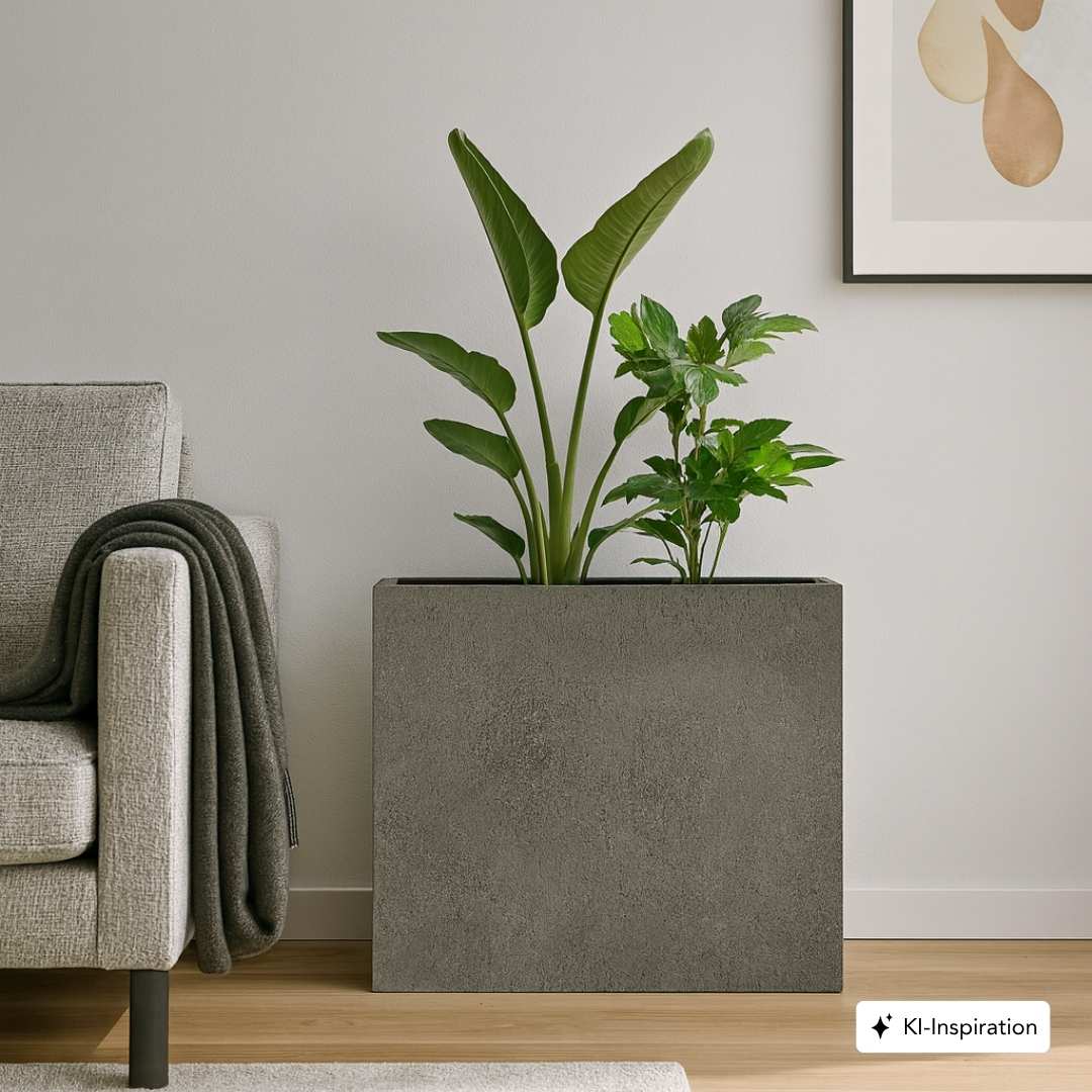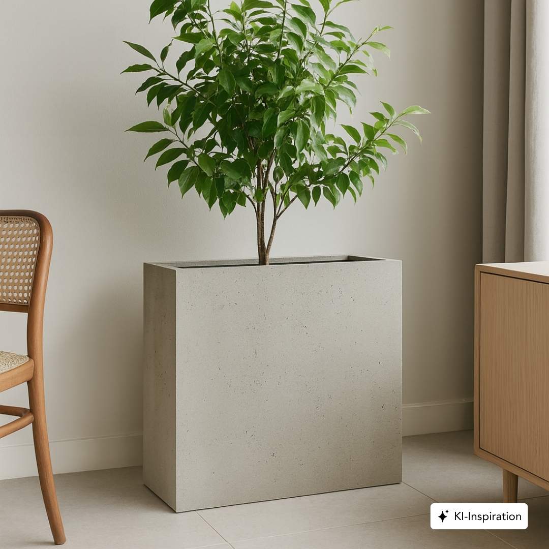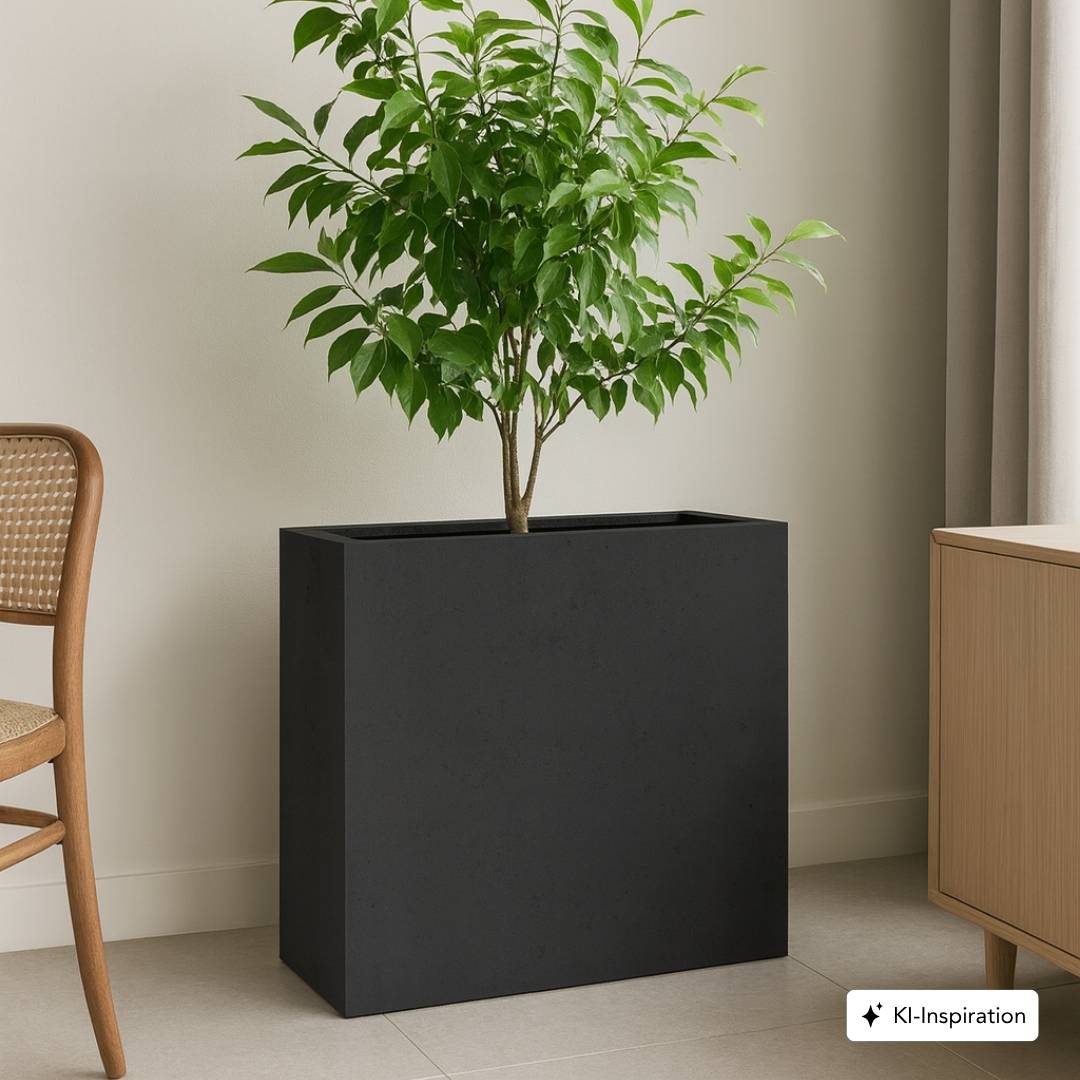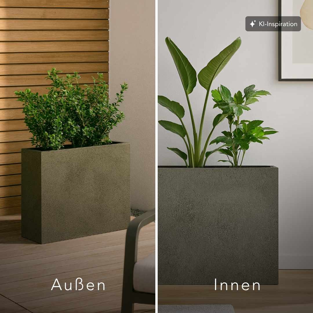 Einige rechteckige Pflanzkübel enthalten eine innenliegende Dämmung aus weißem Hartschaum (falls auf Fotos gezeigt). Diese Dämmung ist im Innenbereich sichtbar. Sie schützt vor Wärme und Kälte, dient zusätzlich der Stabilität des Behälters und sollte nicht entfernt werden.