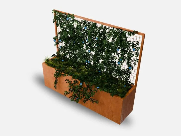 Mit diesem Pflanzkübel mit Rankgitter verwandelst du deine Terrasse oder deinen Balkon in eine grüne Oase. Das stabile Rankgitter bietet Kletterpflanzen wie Clematis, Efeu oder Rosen perfekten Halt und wächst mit der Zeit zu einer lebendigen, natürlichen Sichtschutzwand heran. Der robuste Cortenstahl entwickelt dabei eine einzigartige Rostpatina, die nicht nur schützt, sondern auch modern aussieht.