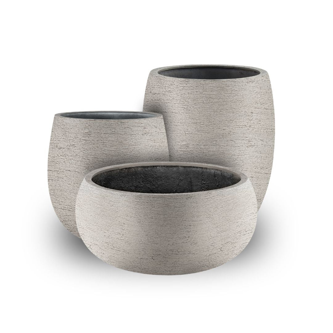 Alle drei Gefäße bestehen aus robustem, wetterfestem Fiebrglas, das durch die strukturierte Lehmoberfläche eine außergewöhnlich natürliche Haptik bietet. Das LILLIAN Bundle fügt sich dank seines sanften Farbtons mühelos in mediterrane, skandinavische oder moderne Outdoor-Konzepte ein.